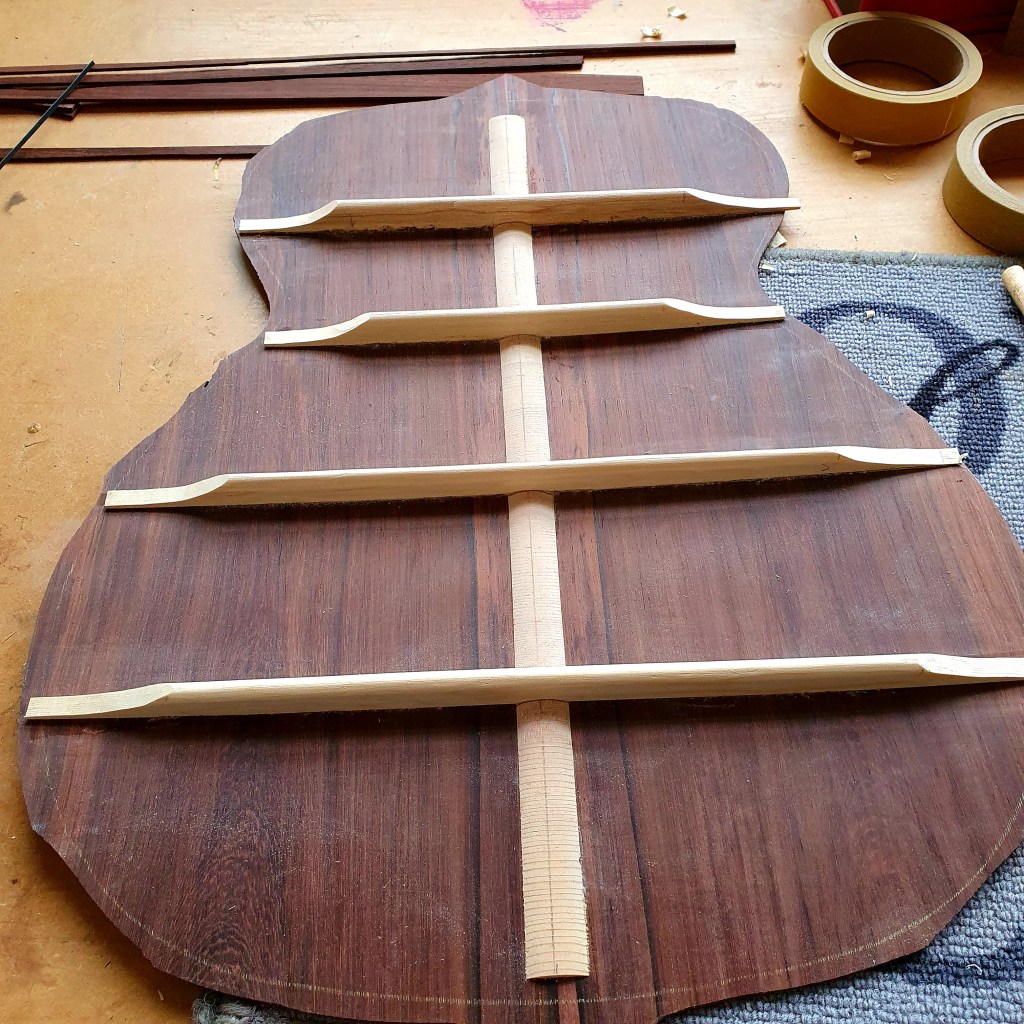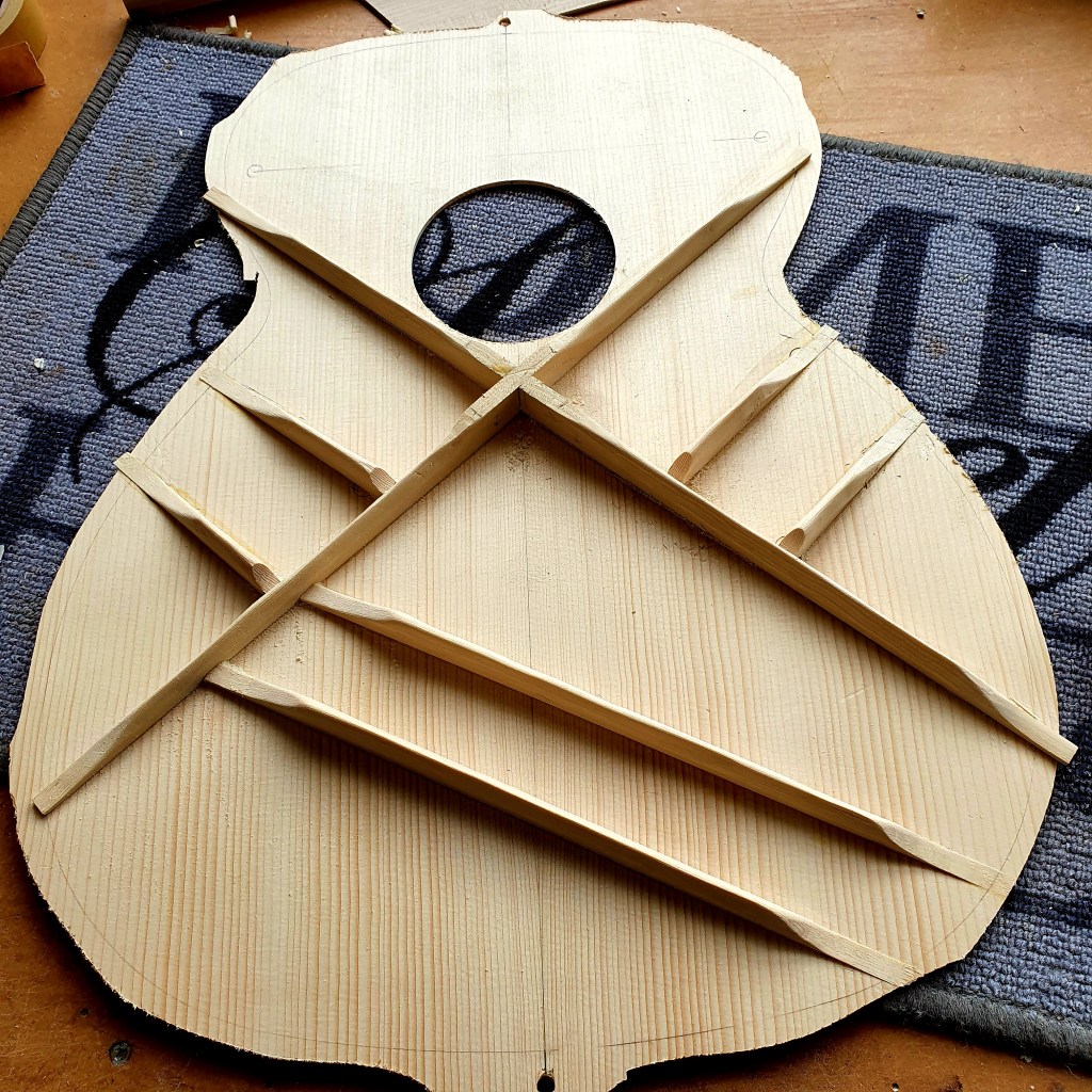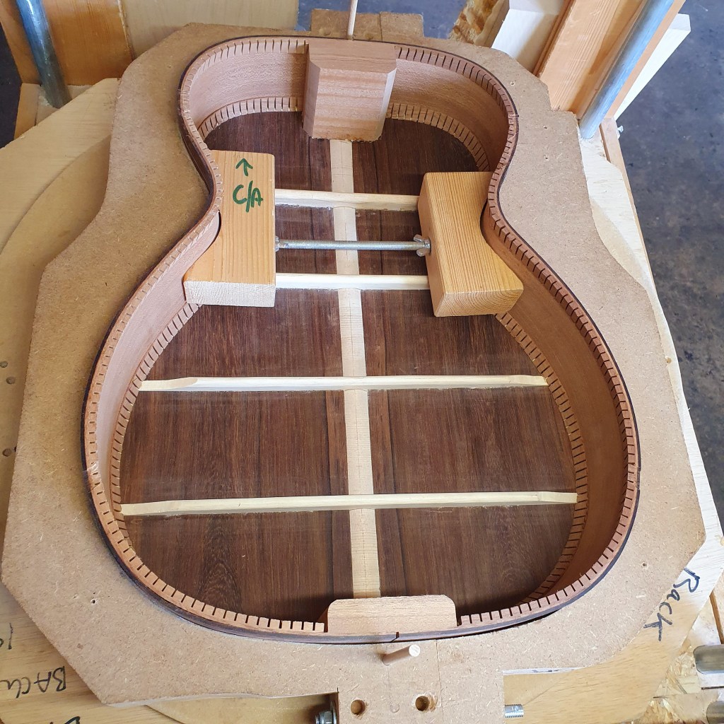 In dit vierde artikel over akoestische gitaarbouw gaan we laten zien hoe de binnenkant van je akoestische gitaar eruit ziet. Niet alle akoestische gitaren hebben dezelfde bracing. De bracing zijn de latjes aan de binnenkant van de gitaar. Wel hebben alle bracings dezelfde functie: de gitaar verstevigen en de akoestiek bevorderen. In onze gitaar zit een X-bracing, zogenoemd door de X-vorm. Dit is de meest voorkomende bracing, andere zijn bijvoorbeeld de V-bracing en de honinggraat bracing. Een derde functie van de bracing is het in vorm houden van de bolling van het top- en achterblad, iets dat we in een eerder artikel hebben laten zien.
