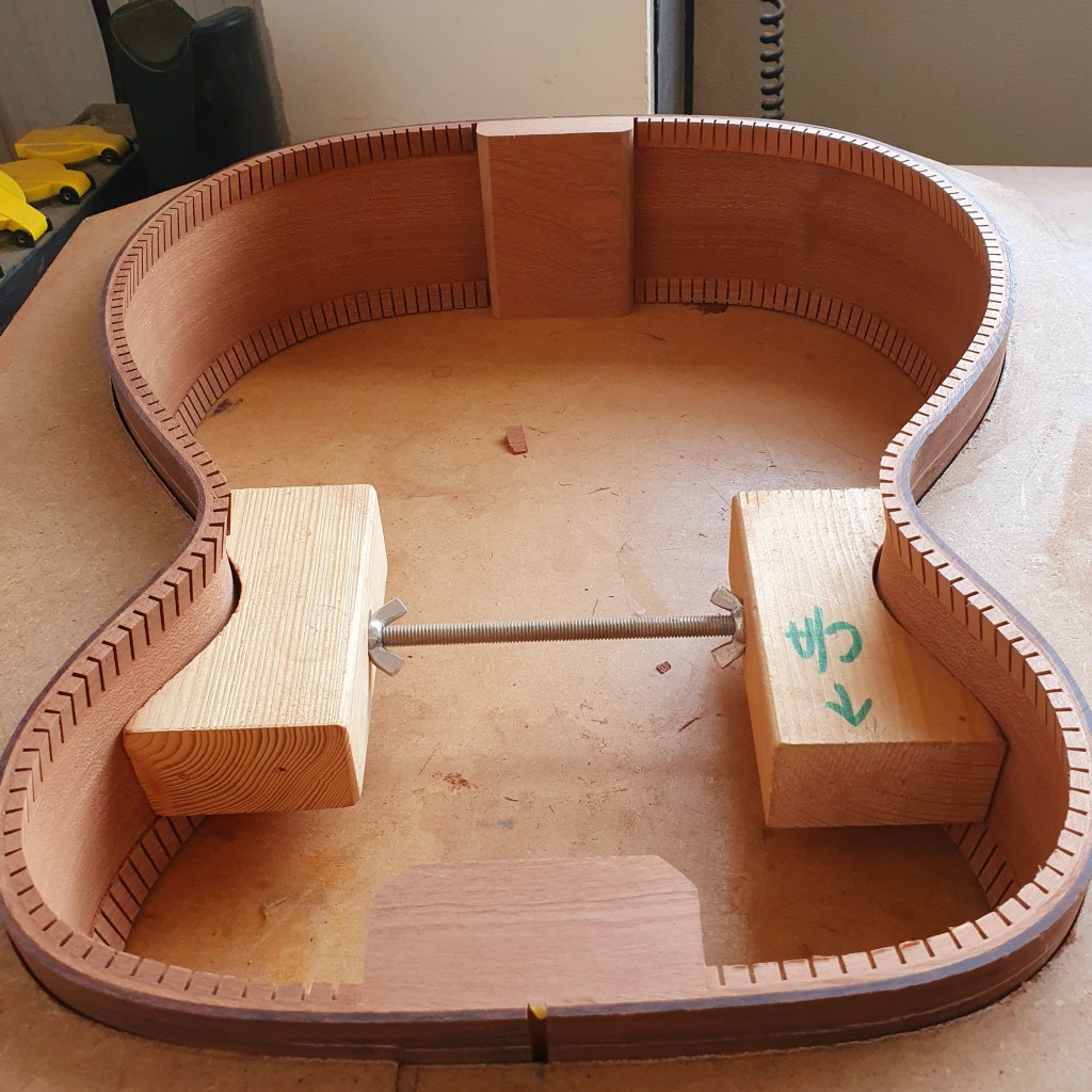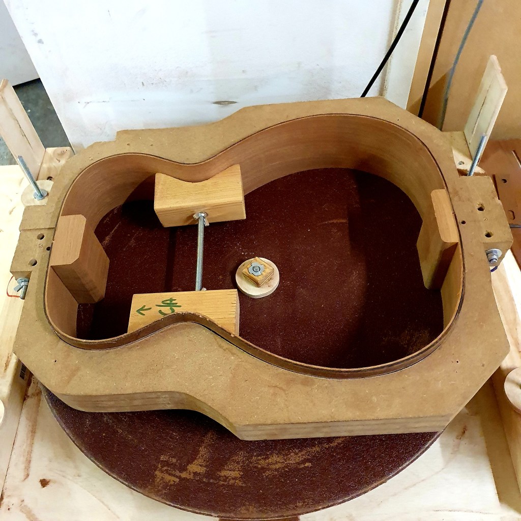 Nadat de zijkanten in vorm zijn gemaakt, komen het hals- en staartblok erin. Deze twee blokken lijmen de zijkanten aan elkaar. Aan het ene wordt later de hals bevestigd en de ander houd de achterkant van de gitaar bij elkaar. In deze gitaar zijn beide blokken uit mahonie van de hals gemaakt, zo is er minder resthout. Om de zijkant op het achterblad te kunnen lijmen, wordt er een houten strip langs de hele rand van de zijkant gelijmd, waarop het blad gelijmd kan worden. Anders zou de rand te smal zijn om voldoende contact te maken. Echter de zijkant is nu recht, terwijl het achterblad een bolling heeft. Daarvoor gaat de zijkant geschuurd worden op de radiusschijf waarmee ook de radius in het achterblad gemaakt is.