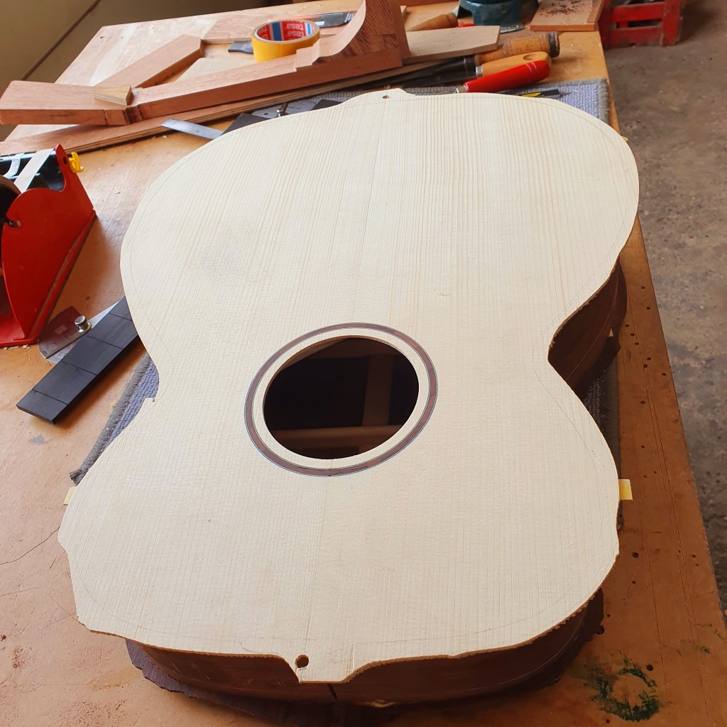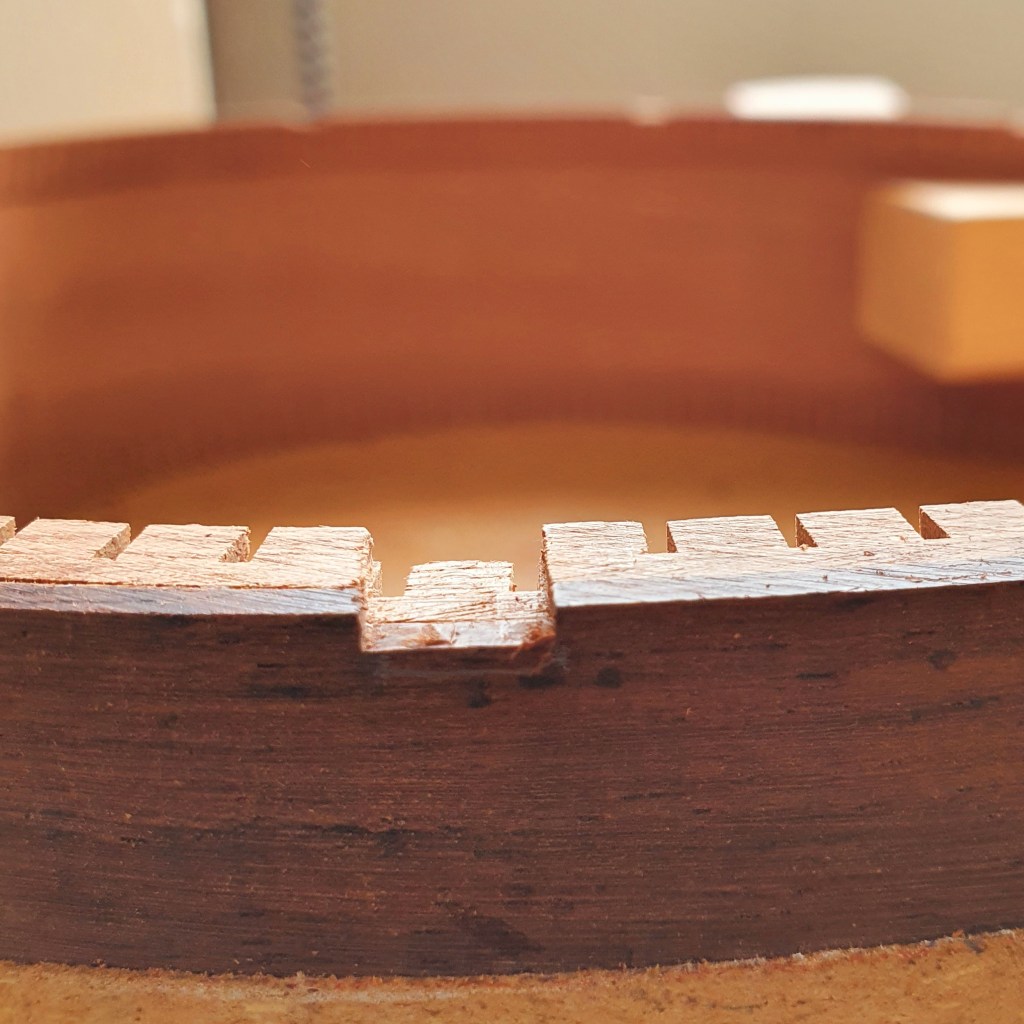 Ook aan de bovenkant van de zijkant komt een houtenstrip, die ook weer in radius geschuurd moet worden. Aan deze kant laten we de bracing door de zijkant komen. Daarvoor moeten er dus ruimtes uit de zijkant gehaald worden, waar de bracing precies in valt. Later zal dit gemaskeerd worden door de binding. Maar wat niemand dus ziet, is dat de bracing van je akoestische gitaar door de zijkant steekt. Als de gaten voor de bracing zijn gefreesd, kan het topblad op de gitaar gelijmd worden en is de ‘box’ geboren!
