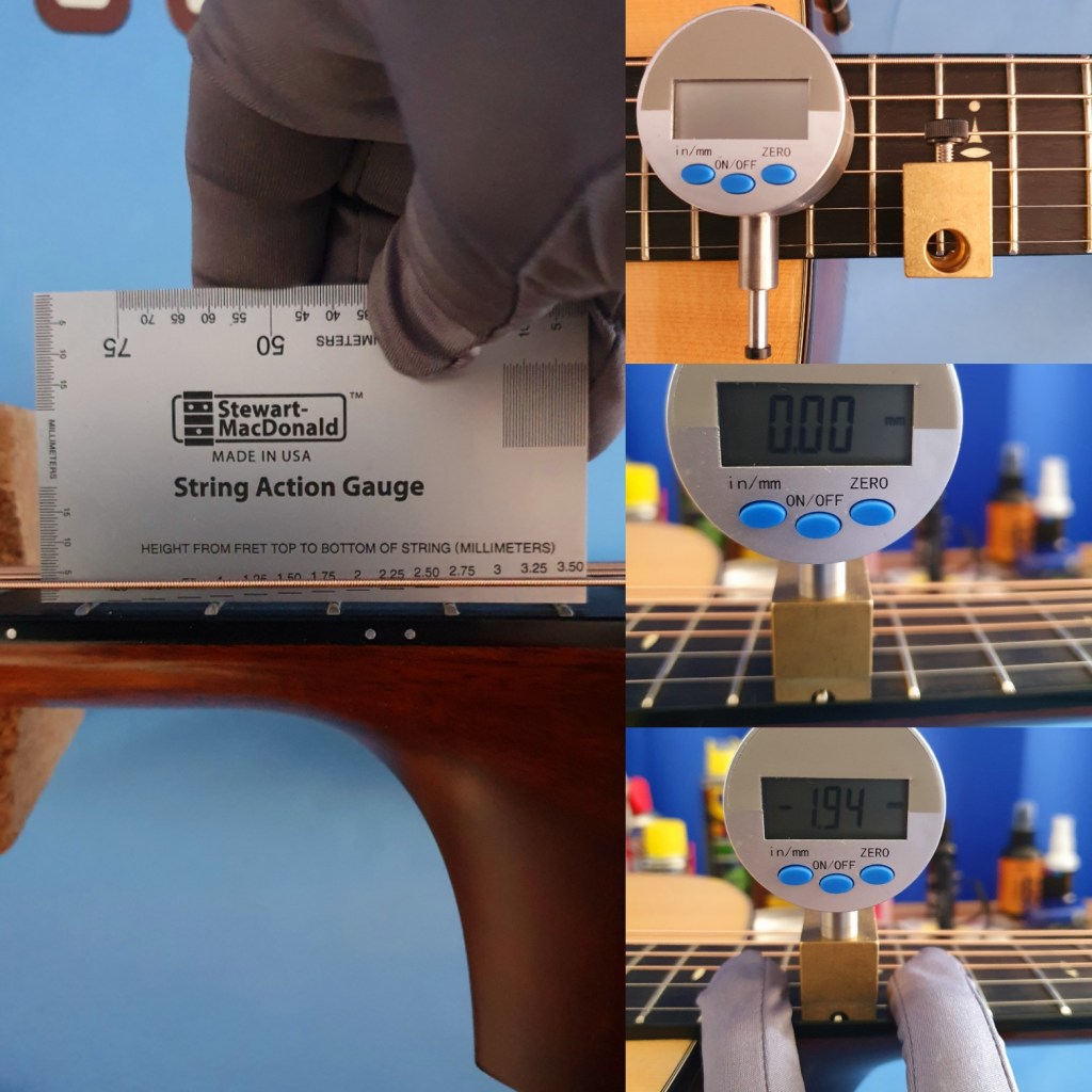 Er zijn verschillende plaatsen op de gitaar waar je de actie kunt afstellen. Frets 1, 3, 12 en 17 komen vaak voor. Het belangrijkste is dat je weet welke methode er is gebruikt, zodat je consequent dezelfde methode gebruikt, of weet waarom je tot afwijkende metingen komt. Wij meten bij alle gitaren de actie bij fret 1 en bij fret 12. De actie bij fret 1 wordt grotendeels bepaald door de topkam. De actie bij fret 12 door de brug en het zadel. Ook de relief van de gitaar speelt een rol in de afstelling van de actie. Relief is de lichte buiging die veel gitaren hebben vanaf ongeveer fret 8 tot en met fret 5. Om de actie precies te meten zijn er twee methoden; met de hand en in speelpositie of met een digitale actie meter terwijl de gitaar plat ligt. Bij de eerste methode heb je geen last van de zwaartekracht die aan de hals en snaren trekt. Het is wel lastiger om tot op de honderdste millimeter nauwkeurig te meten. Bij de tweede methode kunnen we tot op de honderdste millimeter nauwkeurig meten. Hierbij ligt de gitaar wel plat, wat een miniem effect op de hoogte van de snaren heeft. Wederom is het belangrijk om consequent te zijn in de metingen die je gebruikt. Wij gebruiken de digitale methode.